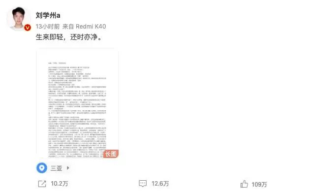 24日凌晨两点,刘学州的舅妈柴某在社交媒体说:“刘学州在三亚海边吃了药,被好心人发现后,正在医院紧急抢救。”凌晨4点过,柴某称刘学州经抢救无效死亡。