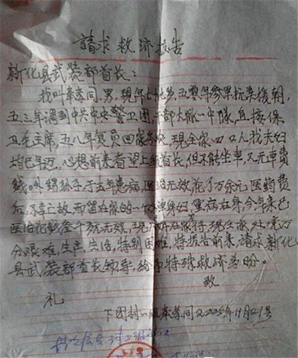 故事要从一封求助信说起。2005年11月的一天,湖南省新化县武装部收到一封78岁老人的来信。对于群众的来信,县武装部工作人员并不意外,打开这封信后,大家都被里面的内容惊呆了。信的标题是“请求救济报告”,全文如下: