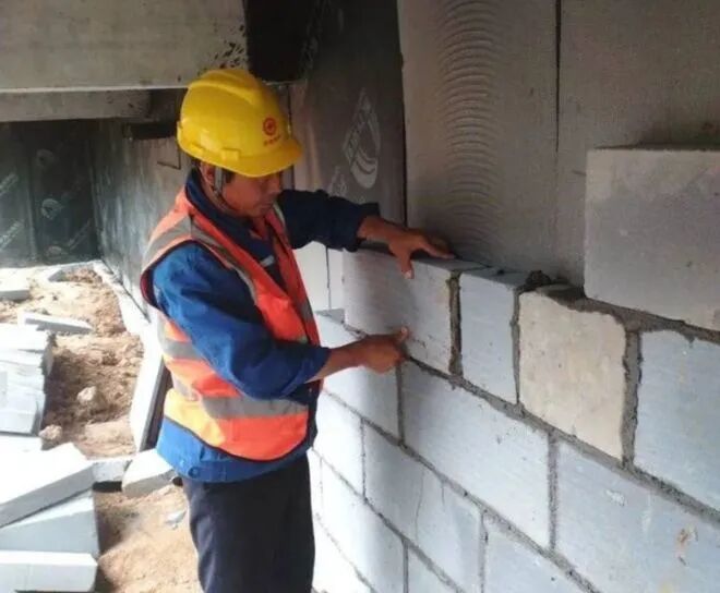 他一手拿着锤子,一手拿着石砖,将石砖用锤子垒在墙面上。