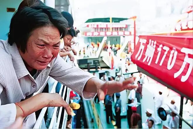 1995年4月10日,三峡库区首批移民在一众哀婉哭泣声中有序展开。