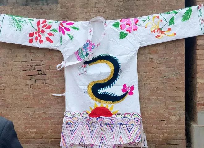 靠着五颜六色的丝线点缀,肥料袋子做成的龙袍也有了几分韵味。