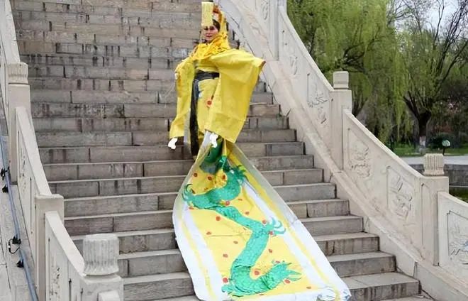 站在公园的石桥上,曹占茹张开了双臂,在镜头前展示着自己的武则天装扮。