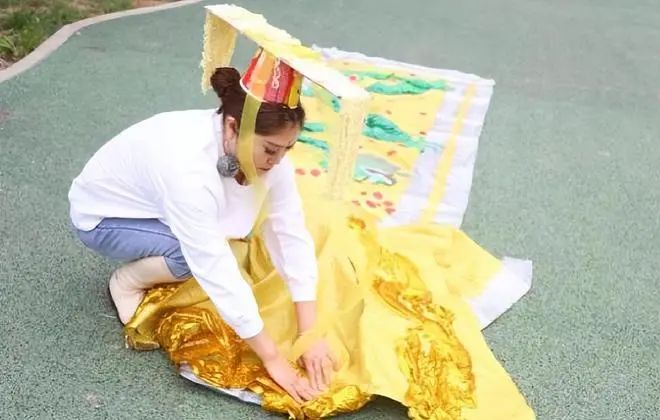 为了最后锦上添花,曹占茹选择了垃圾袋来充当随风飘扬的丝带,增加整体造型的美感。