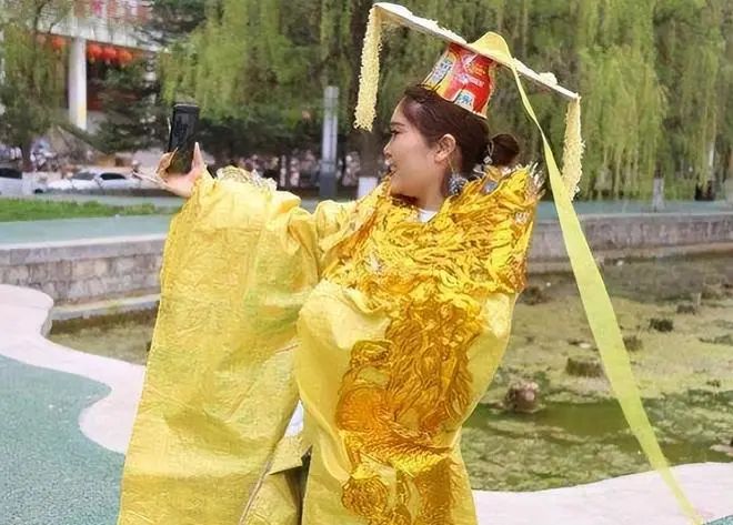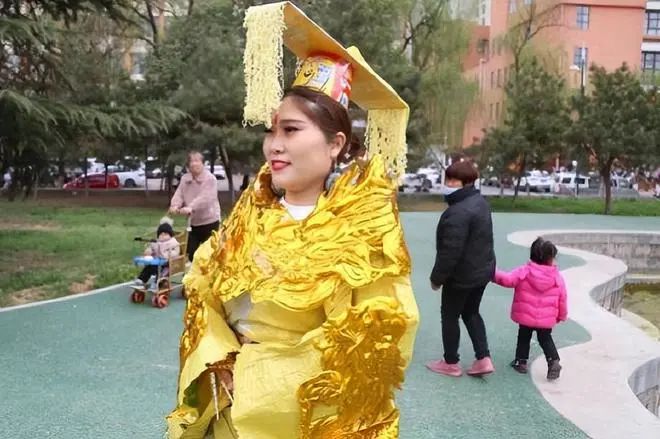 泡面盒子做王冠,煮熟的泡面做王冠上的流苏吊坠,身上的龙袍使用尿素袋子染色编制而成。2018年开始,在短视频平台上,一名作者不断上传着自己的作品。