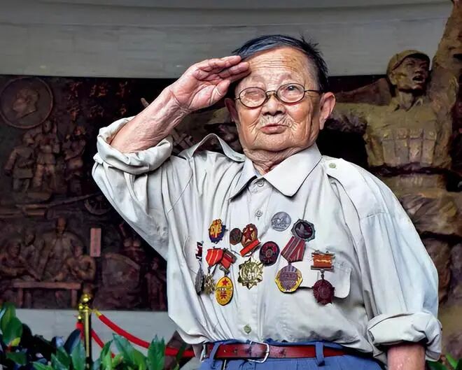 当时,他为了贴近国旗,不由得微微弯腰。这让他在身旁年轻高大的护旗手的衬托下,显得越发矮小。但就是这样一位瘦弱矮小的老人,却潜藏着巨大的能量,因为他是一位“一级人民英雄”。