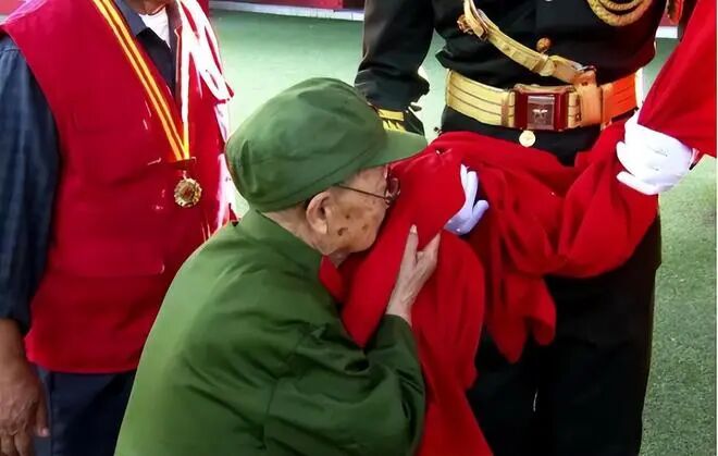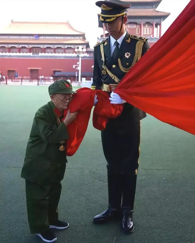 2019年,一张“九旬老兵亲吻国旗”的照片在网上走红。