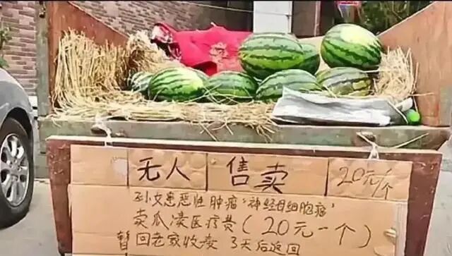 麦收不等人,老汉索性留下一块纸壳,上面写了这样一段话:“无人售卖,20元/个,孙女患恶性肿瘤神经母细胞瘤,卖瓜凑医药费,暂回老家收麦,三天后返回。需要瓜者,自行扫码。”
