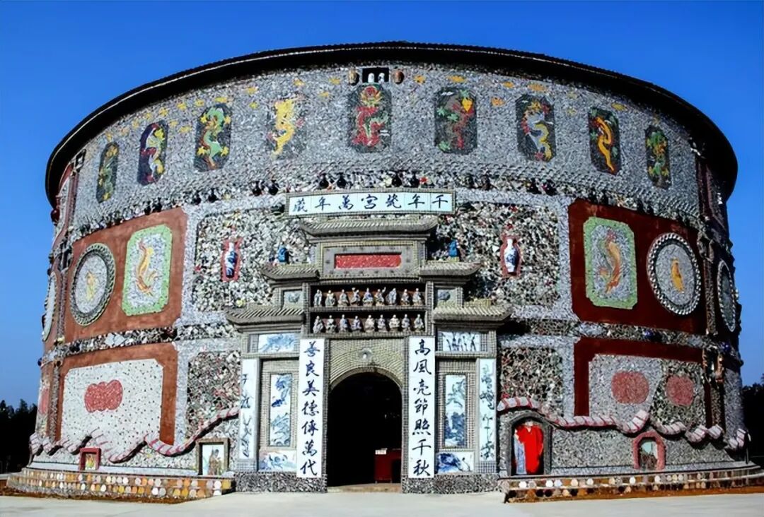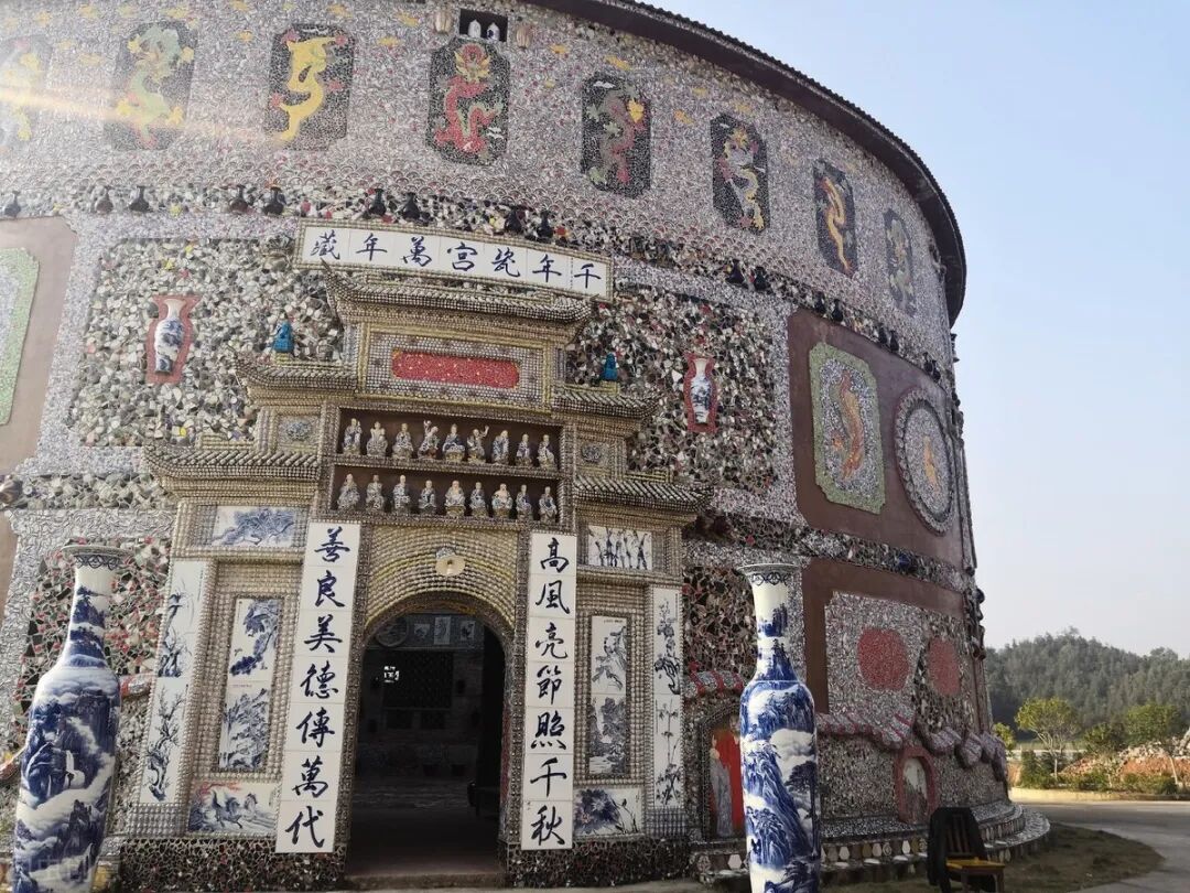 瓷宫的外形仿照福建永定的土楼,除了主体结构采用钢筋混凝土浇灌,其他位置,包括墙面、地面,顶棚、梁柱全都用陶瓷镶嵌和装饰,总共用了80多吨陶瓷碎片,共计6万多件瓷器。