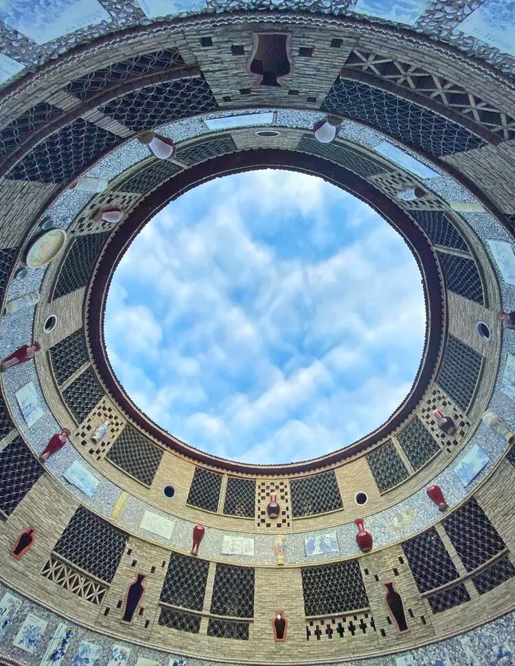 整个建筑的周身,都镶嵌或装饰了数以万计的、各式各样的陶瓷制品,有瓷片、有磁盘,有瓷瓶,有瓷人等,组成了一幅幅五彩斑斓、美轮美奂的陶瓷画卷。