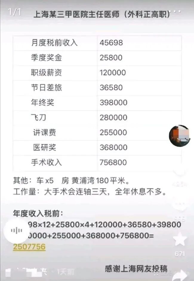 近日,一网友@医昧平生分享了来自上海某三甲医院主任医师年入250万的收入明细图,在互联网引起一场激烈的讨论: