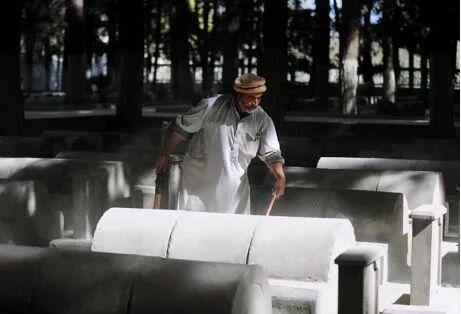 无论寒冬酷暑,艾哈迈德每天要打扫陵园三到四遍。他用扫把与拖把清扫落叶和灰尘,然后用抹布仔仔细细地擦拭着每一块墓碑。