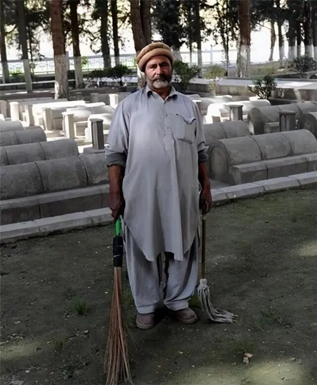 从20多岁的年轻小伙到60多岁的花白老人,阿里·艾哈迈德手持扫把、拖把、木桶和抹布,在一座中国烈士陵园内坚守了44年。