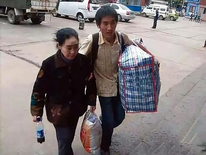 瘦弱的刘秀祥,小心翼翼地背着母亲从车上走下来,