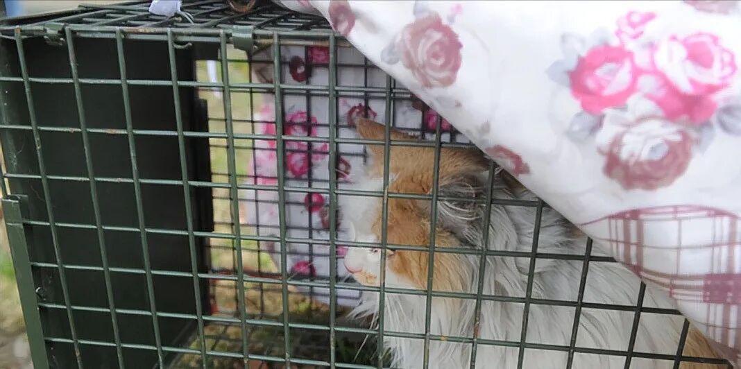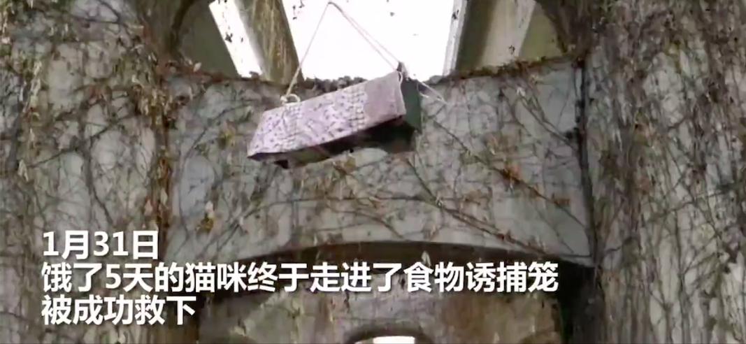 志愿者从高架桥上将装入诱捕笼的流浪猫救下