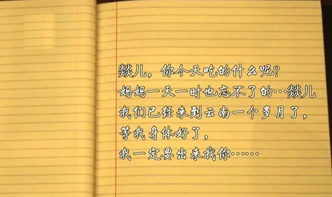 燚儿,你今天吃的什么呢?妈妈一天一时也忘不了。我们已经来到云南一个多月了,等我身体好了,我一定要出来找你。