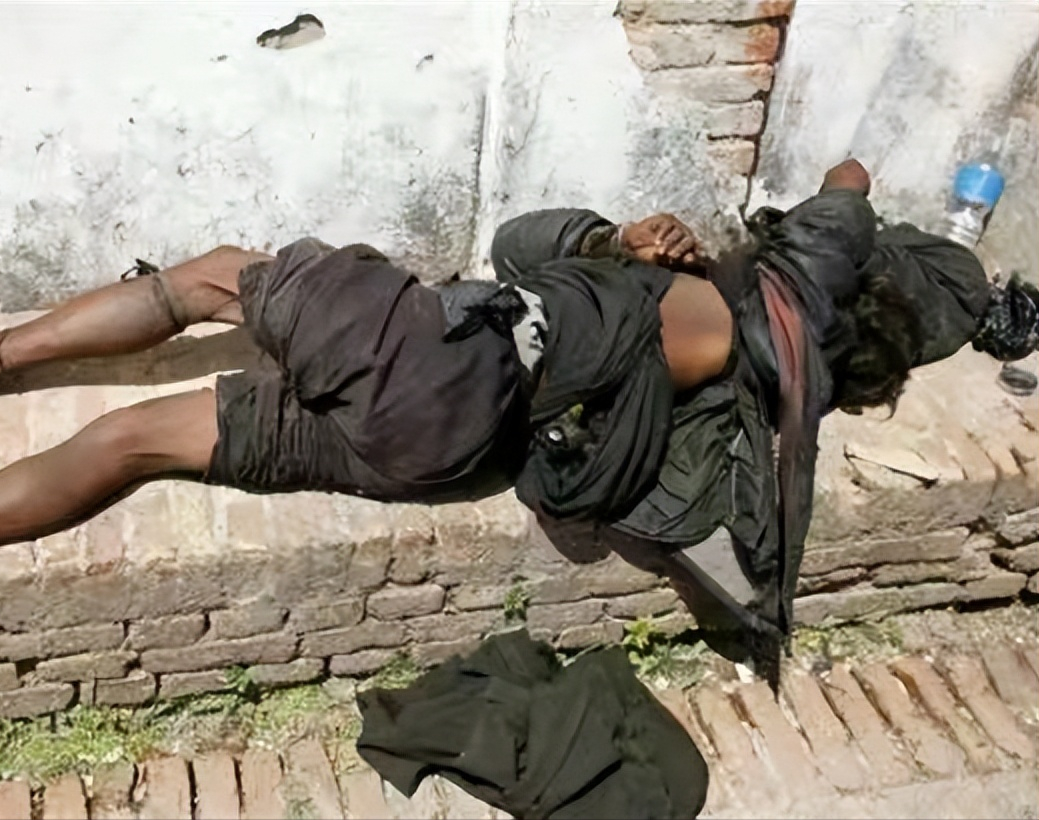 只见这个流浪汉蓬头垢面、衣衫褴褛、瘦骨嶙峋,模样十分狼狈。仔细一看,更让人心痛的一幕发生了: