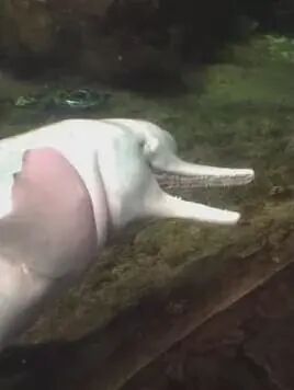 影片中,可以清楚看到一只淡水豚靠在水族箱前,