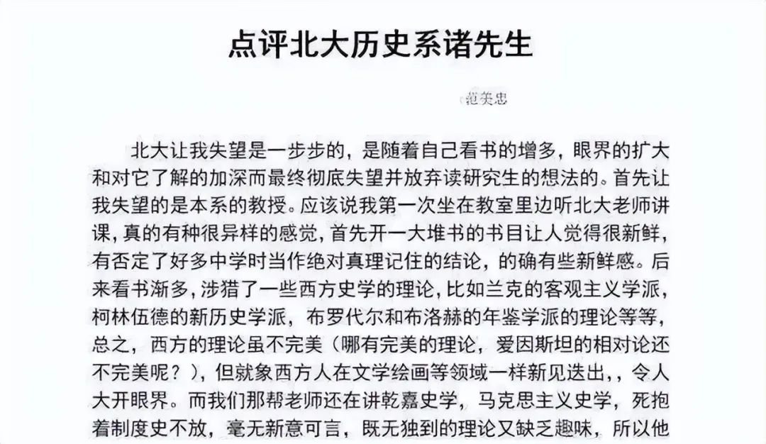 毕业时,他意气风发写了一篇《点评北大历史系诸先生》的文章,把自己的老师挨个骂了一个遍,还说北大老师三分之一是混混。