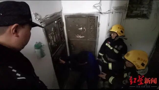 考虑到屋内的安全情况,救援人员使用撬棍破门进入。