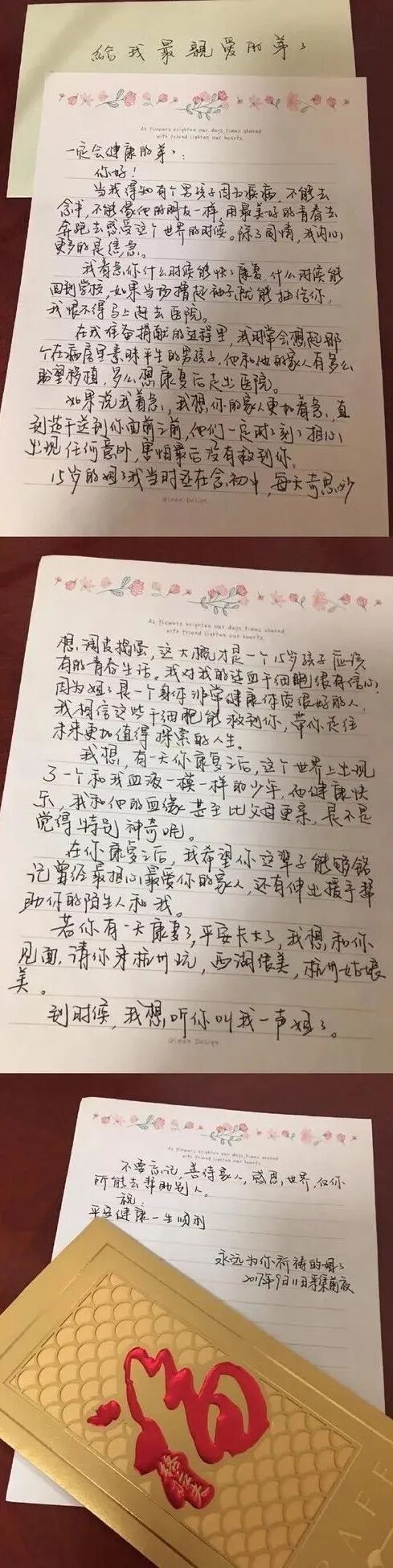 随后许艾菲又写了一封送给男孩的信,在信中为男孩加油,让他鼓起勇气面对病魔,一定可以取得最终的胜利!