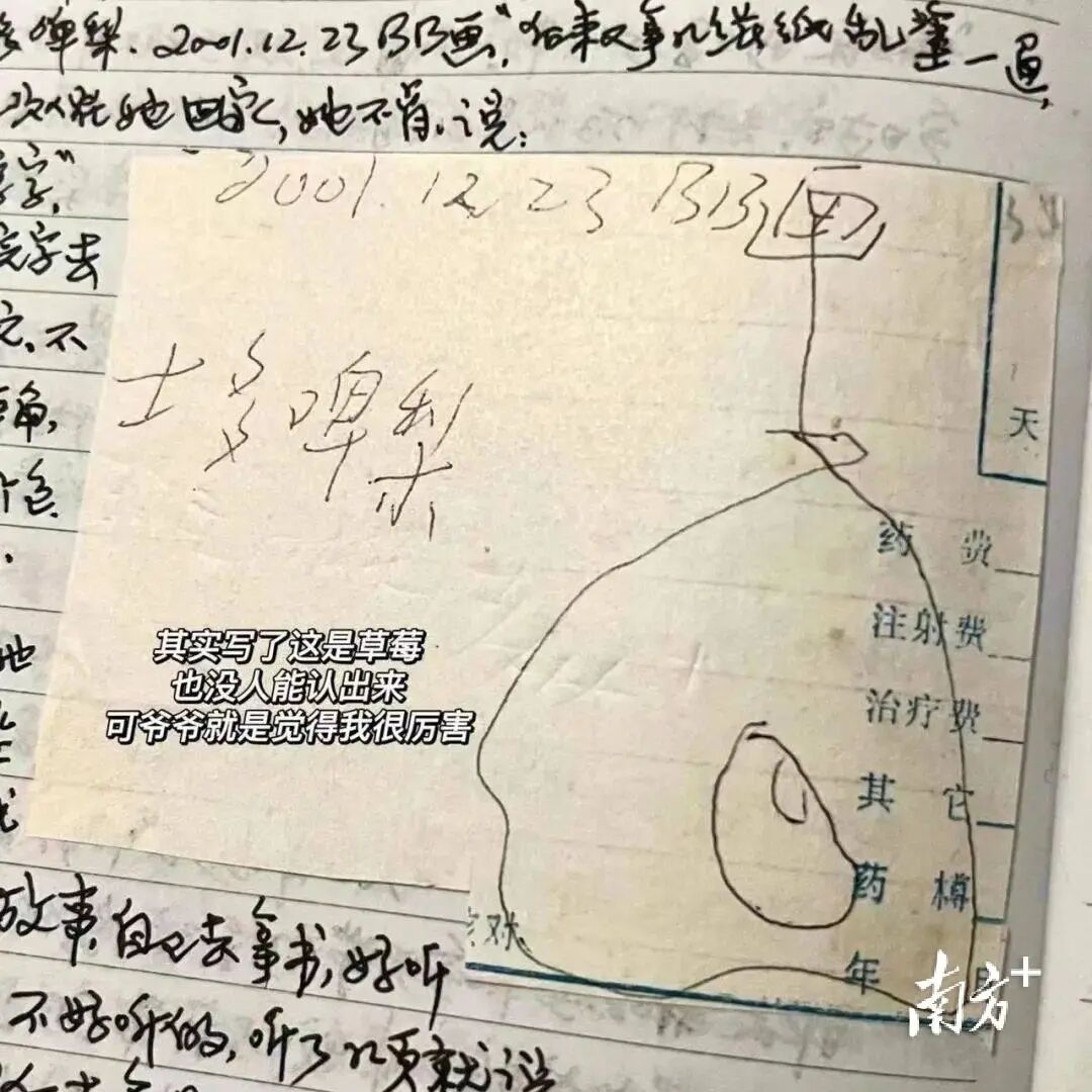 日记本里夹着一张泛黄的纸,上面有一个陈潞2岁时画下的图案,陈千炜在一旁标注“士多啤梨”(草莓)。陈潞说:“其实写了是草莓也没人能认出来,可爷爷就是觉得我很厉害。”