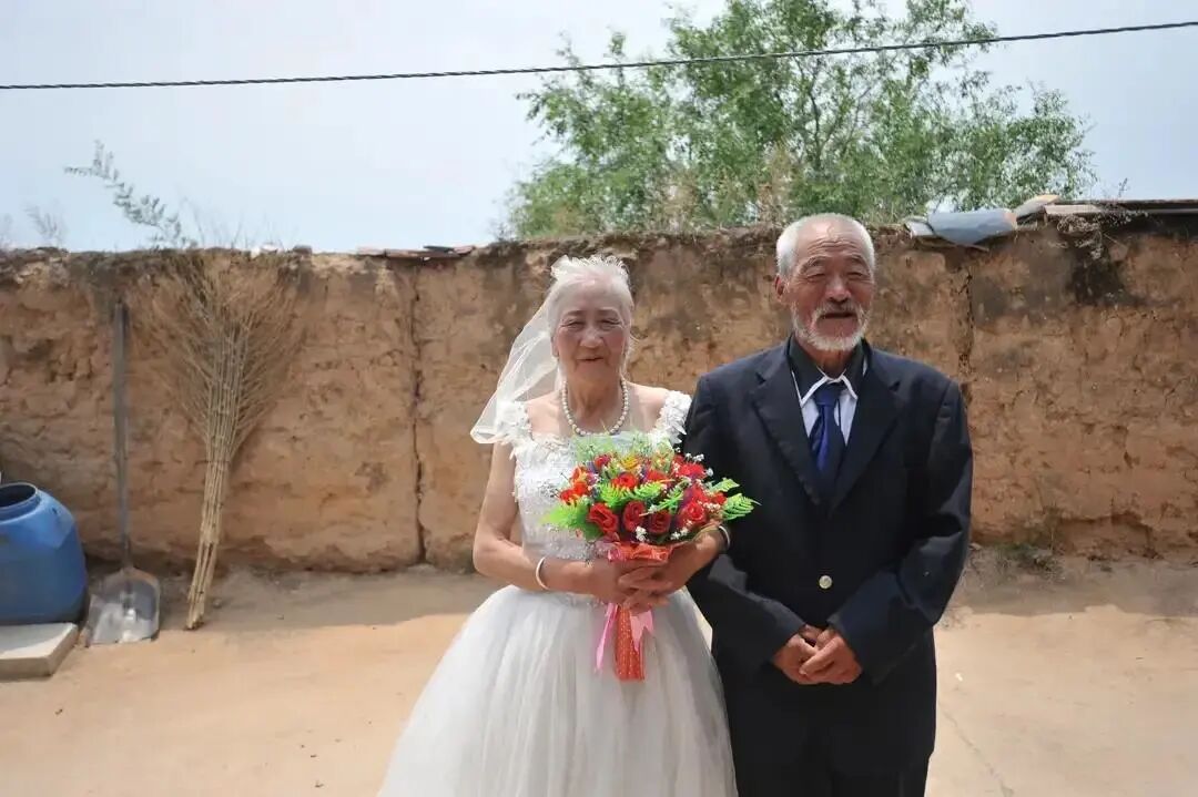 两位年过七旬的老人,互相扶着手走过短短十几米的土路,站在自家的院子里,拍摄了他们俩唯一一次的婚纱照,