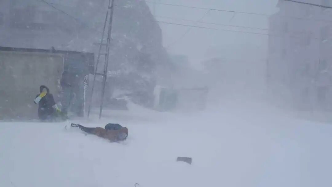 父女俩离开学校,车辆根本无法通行,他们只好用稻草捆着鞋,手牵着手,在冰上一步步挪。