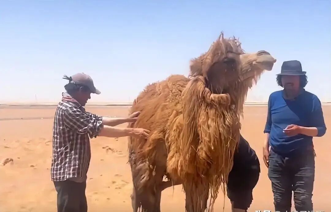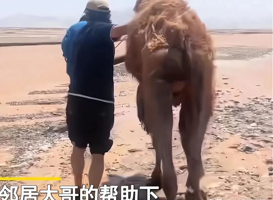 好在邻居大哥的帮助和主人齐心协力下,主人才顺利将骆驼给拉上来。几经周折,母骆驼终于是平安归来。这只驼母骆驼已经有32岁的高龄,由于年纪太大,现已经跟不上驼群,草也快咬不动了。被困在洪流中,已经四天四夜,自己无法动弹。