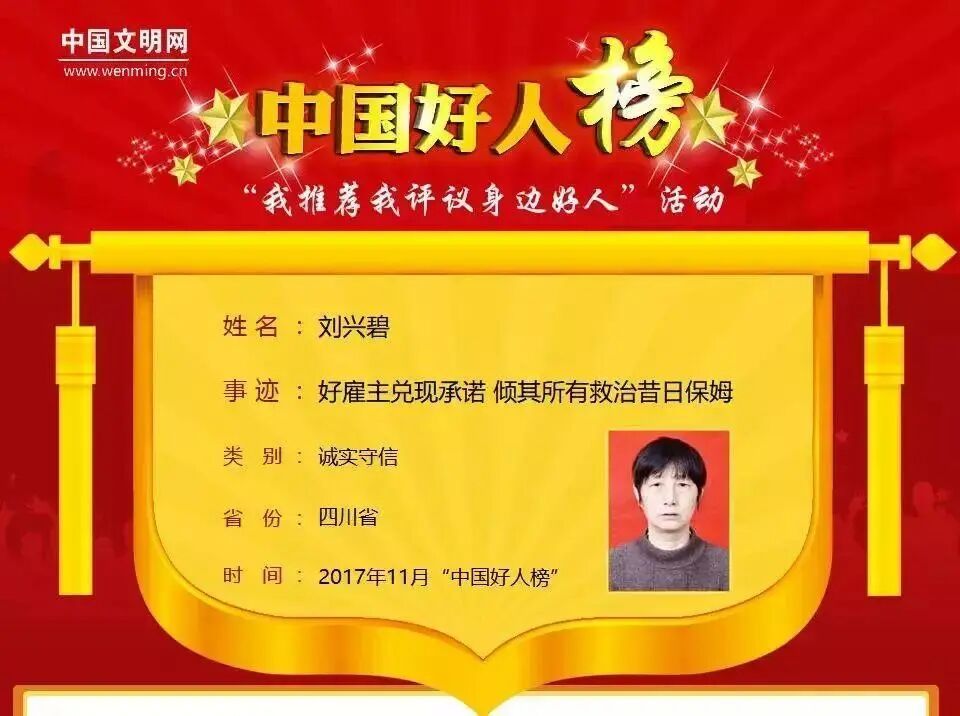 因为人间大爱的良善行为,刘兴碧先后获得了“四川好人”、“感动四川年度人物”、“感动万源十大年度人物”等荣誉,并入选了中国好人榜。