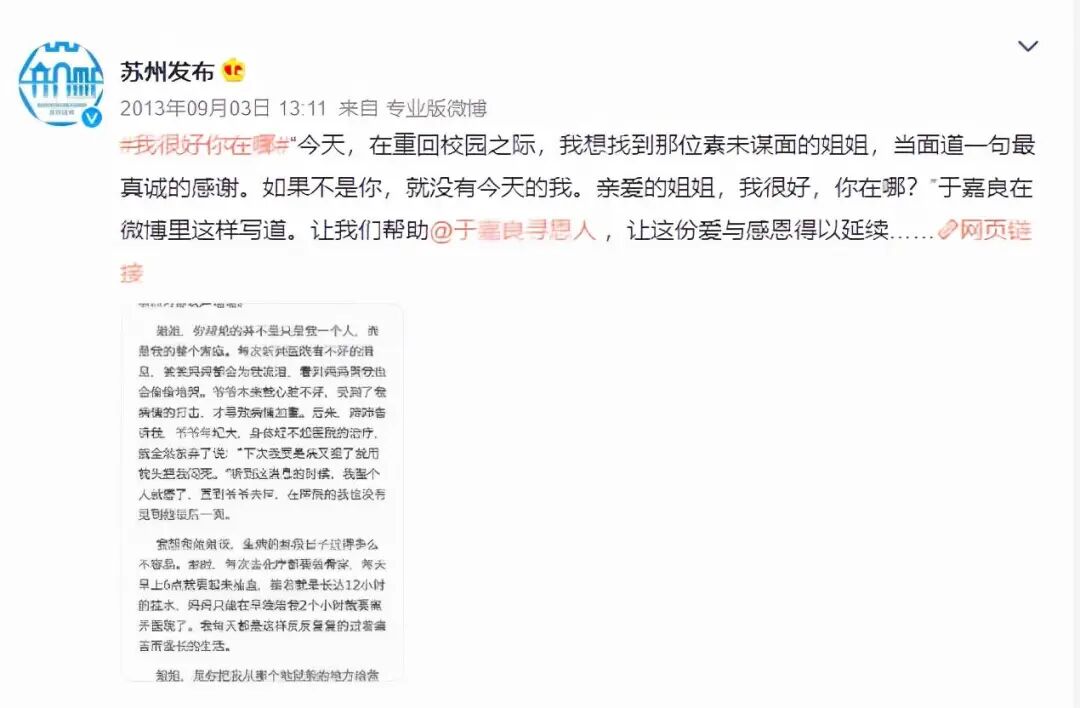 于嘉良的寻人帖立刻引来众多媒体的关注,“中华骨髓库”、“苏州发布”等官方账号相继转发,帮助于嘉良同学。