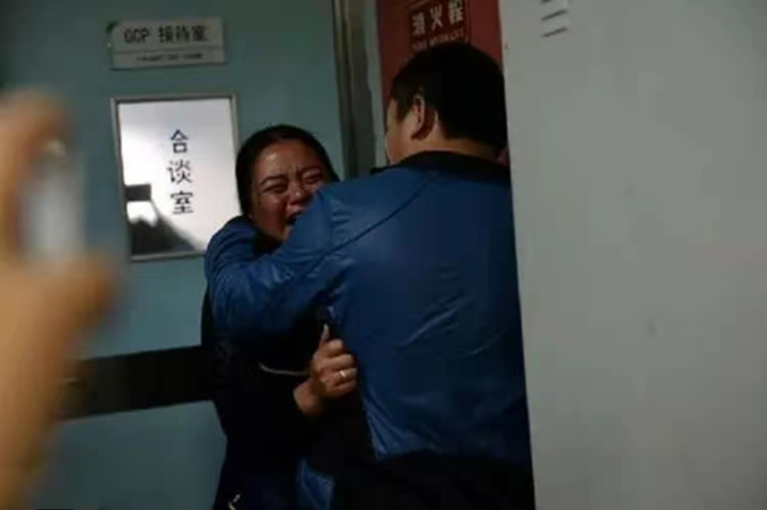 母子二人相拥哭泣,诉说着这18年来的离别之痛。
