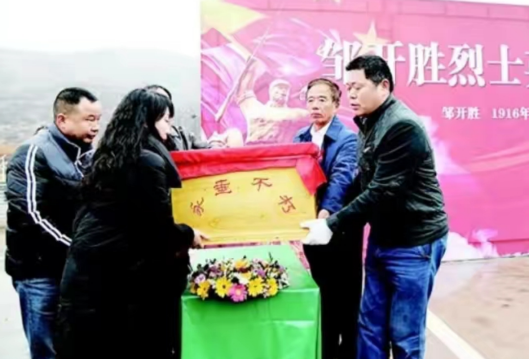 2019年4月18日,一切准备就绪后,邹开胜的后人将邹开胜的英灵接回故土,看到外公邹开胜的遗骸回到故土,张女士激动地说道:“外婆最大的愿望就是找回外公的遗骸,今天她的心愿终于实现了。”