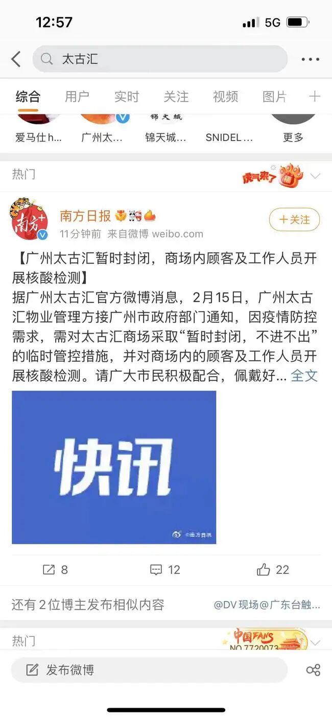 2月15日,先是广州太古汇曝出暂时关闭,实行只进不出的政策,商场内的所有工作人员和顾客要展开核酸检测,很多人已经猜到应该是有疑似的案例了。