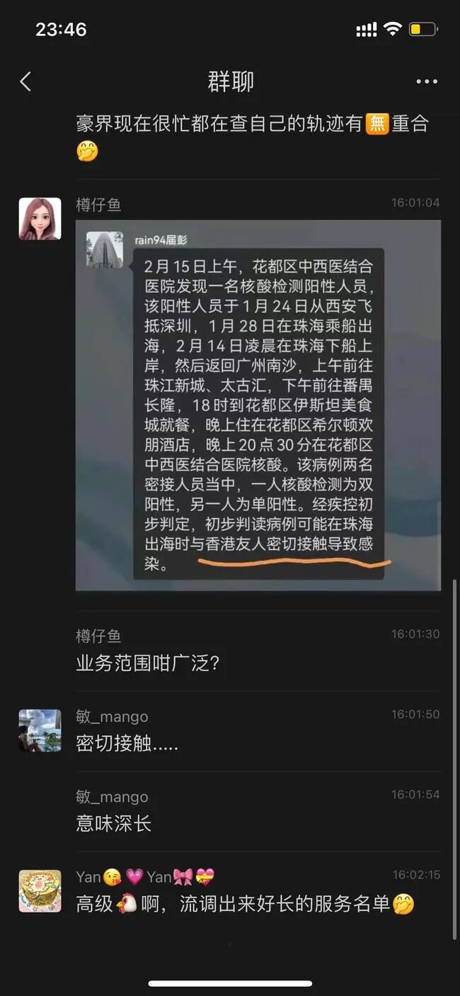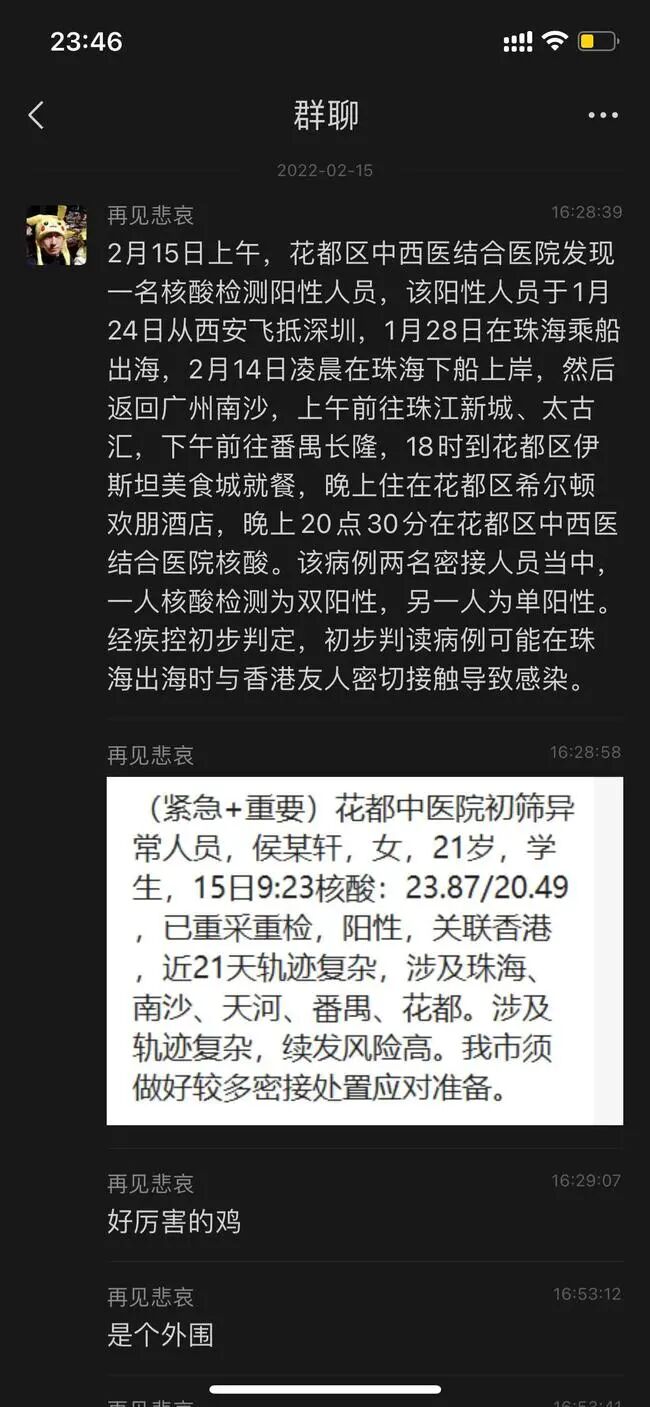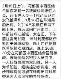 2月15日上午,花都区中西医结合医院发现一名核酸检测阳性人员,该阳性人员于1月24日从西安飞抵深圳。1月28日在珠海乘船出海,2月14日凌晨在珠海下船上岸,然后返回广州南沙,上午前往珠江新城、太古汇,下午前往番禺长隆,18时到花都区伊斯坦美食城就餐,晚上住在花都区希尔顿欢朋酒店,晚上20点30分在花都区中西医结合医院核酸。该病例两名密接人员当中,一人核酸检测为双阳性,另一人为单阳性。经疾控初步判定,初步判读病例可能在珠海出海时与香港友人密切接触导致感染。