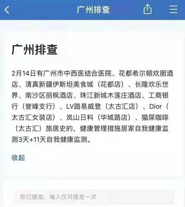 就在这之后,网上出了公示:2月14日有广州市中西医结合医院、花都希尔顿欢朋酒店、清真新疆伊斯坦美食城(花都店)、长隆欢乐世界、南沙区丽枫酒店、珠江新城木莲庄酒店、工商银行(誉峰支行)、LV路易威登(太古汇店)、Dior(太古汇女装店)、岚山日料(华城路店)、猫屎咖啡(太古汇)旅居史的,健康管理措施居家自我健康监测3天+11天自我健康监测。
