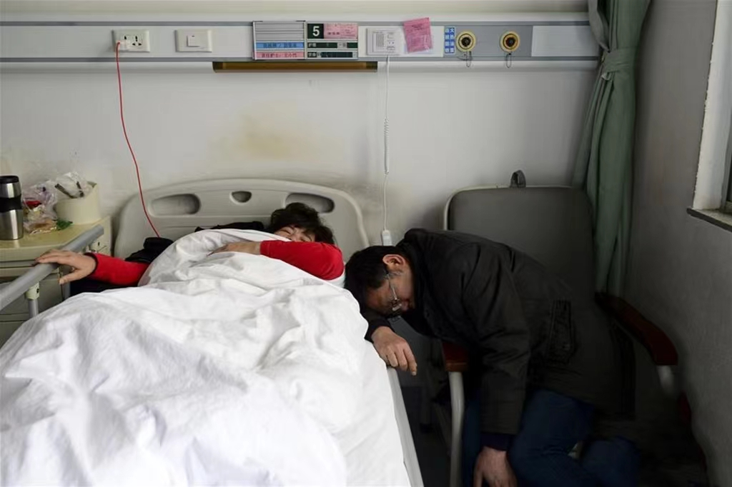 宗锡文不离妻子半步,他用棉签沾湿温水,小心翼翼地为妻子湿润干裂的嘴唇。