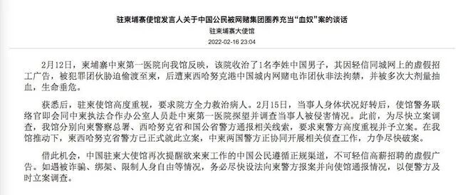 2022年2月12日,一位在柬埔寨的中国小伙被网赌集团圈养“抽血卖钱”的消息在网上流传.