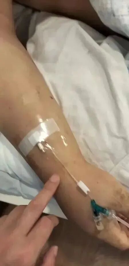 医生指出李亚缘纶手臂上有多处针眼 图源:中柬义工队提供视频截屏