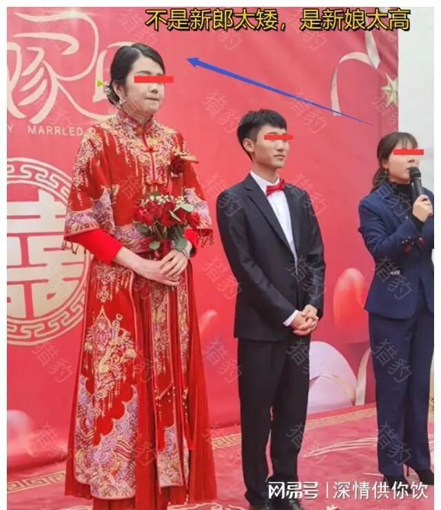 不是新郎太矮,而是新娘太高,因为站在新郎旁边的婚礼主持人穿着高跟鞋也比新郎矮,据参加的宾客表示,目测女方身高有1米8以上。
