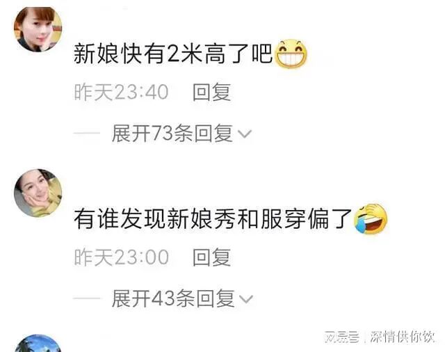 女方本应该小鸟依人,没想到却是大鹏展翅,新郎乖得像个孩子一样,两人在身材上很互补,还有网友调侃:花同样的价钱,你挑了个最大的,值了!