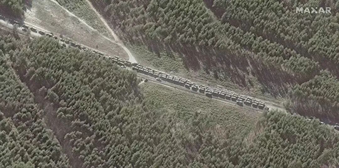 ▲2月28日,卫星图像显示,俄罗斯的军车车队在乌克兰首都基辅以北绵延。(人民视觉)
