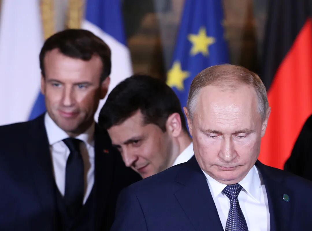 ▲资料照片:2019年12月9日,法国总统马克龙、乌克兰总统泽连斯基、俄罗斯总统普京(从左到右)在法国巴黎出席“诺曼底模式”四国峰会。(新华社)