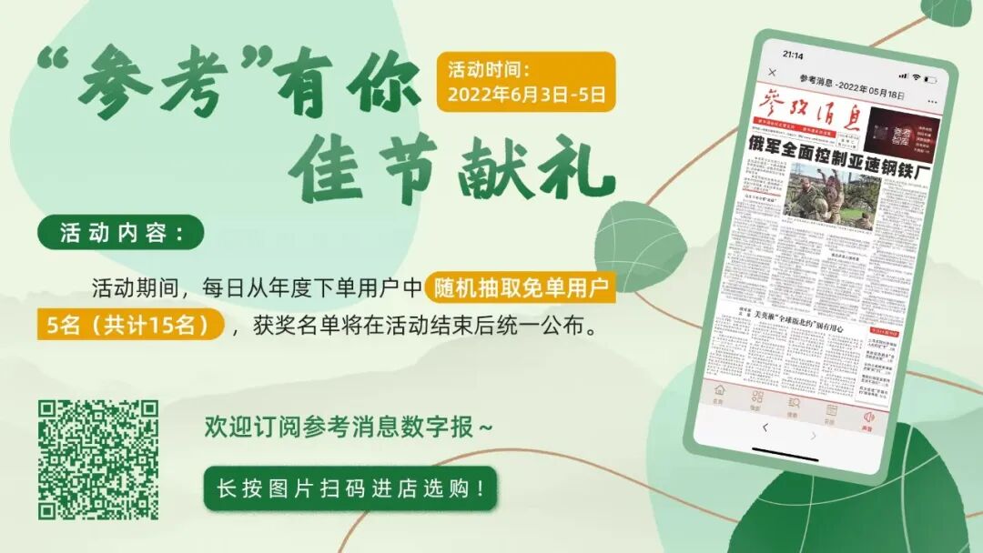 6月3日至5日,我们每天将从《参考消息》数字报的年度(含转赠产品)下单用户中随机抽取5名,进行免单放送。