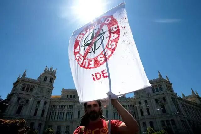▲6月26日,在西班牙首都马德里,数千人参加反对北约、呼吁世界和平大游行。(新华社发,胡安·卡洛斯·罗哈斯摄)