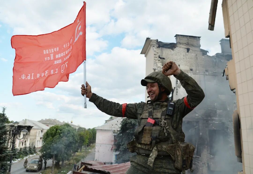 ▲当地时间2022年7月2日,卢甘斯克地区,利西昌斯克市行政大楼上,卢甘斯克武装第6哥萨克团的一名战士在悬挂前苏联的旗帜。(人民视觉)