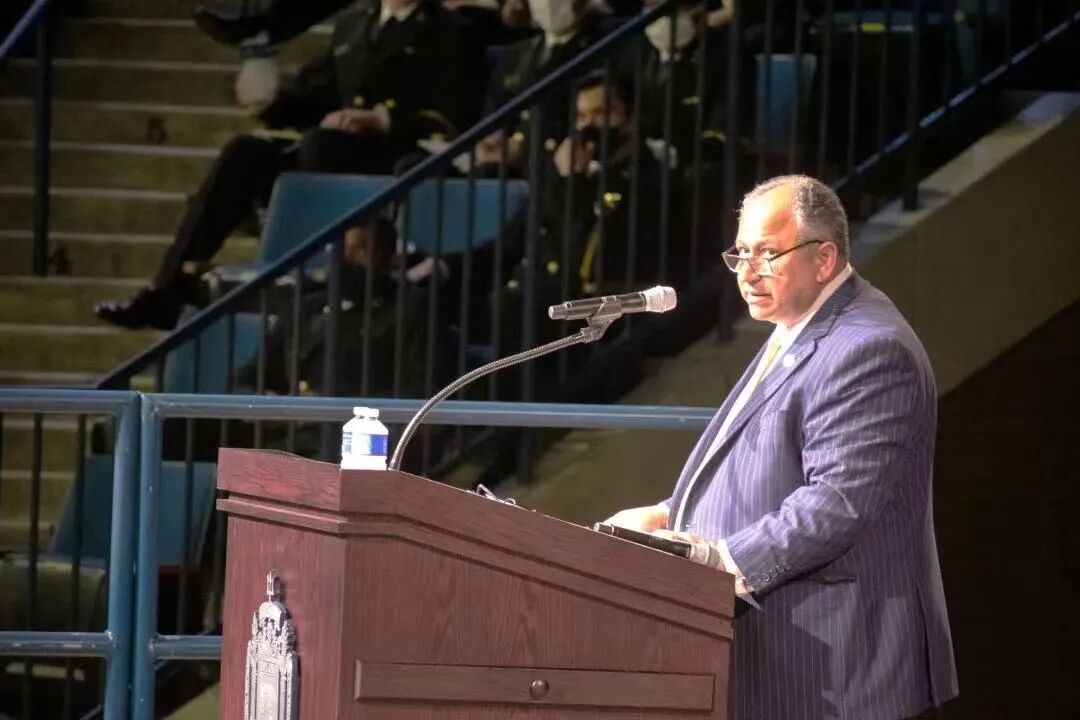 ▲美国海军部长德尔托罗演讲现场图。(美国海军学院网站)