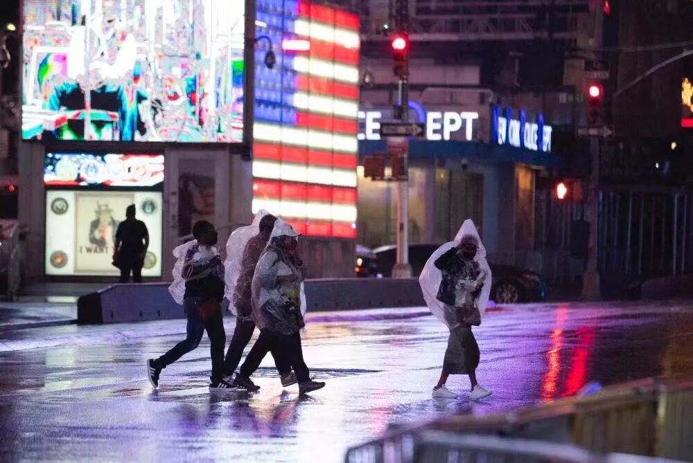 ▲9月2日,人们冒雨走在美国纽约时报广场上。受飓风“艾达”影响,暴雨1日晚开始袭击纽约市及周边地区,并引发洪涝灾害。(新华社)