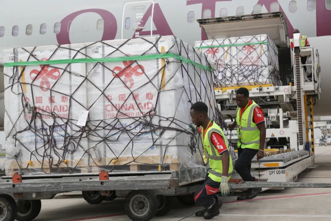 ▲11月1日,在坦桑尼亚达累斯萨拉姆尼雷尔国际机场,工作人员搬运中国援助的新冠疫苗。 新华社发(赫曼·伊曼努尔摄)