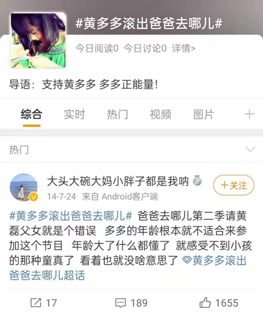 最狠的是网友们竟然自发在微博上发起了一个叫做#黄多多滚出爸爸去哪儿#的话题。