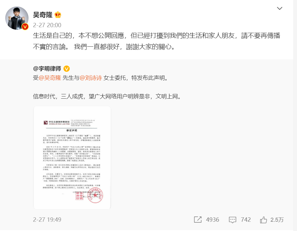 事情越闹越大,吴奇隆和刘诗诗赶紧委托律师公开否认离婚传言,并表示:“我们一直都很好。”